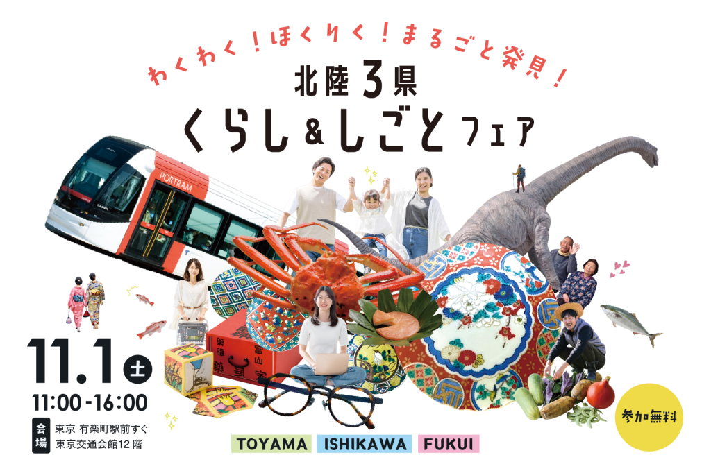 「北陸3県 くらし&しごとフェア」に参加します。 2025.10.01 令和7年11月1日(土)東京交通会館(有楽町駅すぐ)で開催される「北陸3県 くらし&しごとフェア」に参加します。 富山県での仕事をお探しの方、移住を希望されている方など、お気軽にお越しください。 一覧に戻る